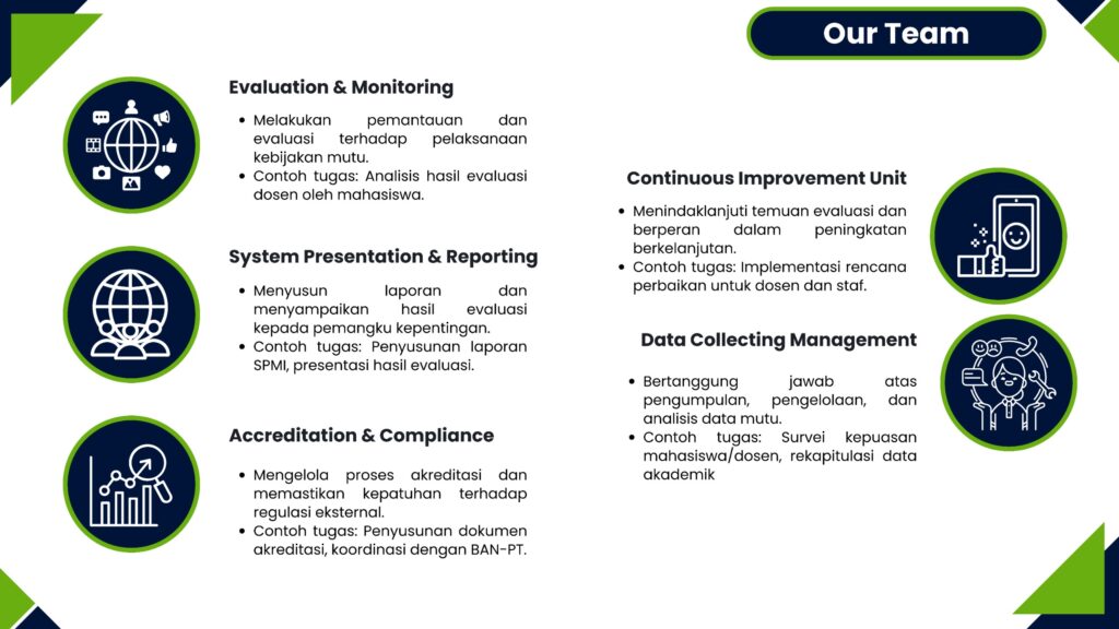 Tim Lembaga Sistem Penjaminan Mutu Universitas Bandar Lampung bertanggung jawab memastikan mutu akademik dan non-akademik berjalan sesuai standar yang ditetapkan. Dengan kerja sama dan koordinasi yang matang, tim ini terus mendukung perbaikan mutu secara berkelanjutan demi tercapainya visi universitas.